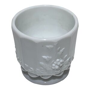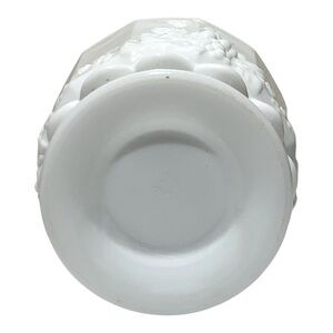 Beautiful milk glass paneled trinket jar or lidless sugar bowl in Westmorland’s “Grape & Cables” pattern. Excellent vintage piece with no chips or cracks.