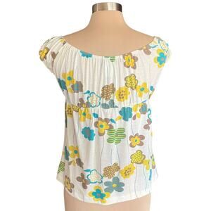 Vintage Wet Seal Y2K Babydoll Top Mod Floral Print Retro 70s Inspired Boho. Cream with brown, aqual, and yellow flowers, 70's style print. Knit top with elastic neckline. Cap sleeves has elastic as well. Empire waistline with elastic. In very good preowned condition.