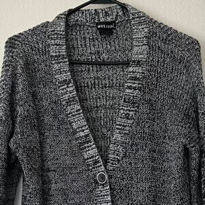 Women’s Vintage Wet Seal black and white speckled knit cardigan, perfect for layering. It features a v-neck, front button closure, and two front pockets. The cozy, soft knit material makes it a versatile piece for any season
