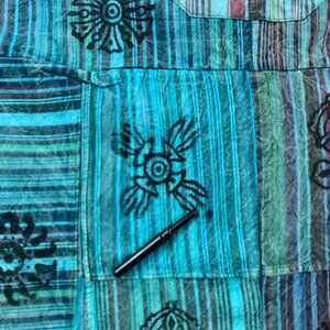 Great used condition, 100% cotton crinkle lightweight jumpsuit has no significant signs of natural wear or overuse. Patchwork construction, unlined, side buttons for easy on/off, adjustable button straps. Slouchy fit, straight legs. Hand stamped print isn't perfect, and one "blotch" on front as shown in photos - doesn't take away from the overall aesthetic at all. Labeled ONE SIZE, but fairly roomy, please reference measurements for sizing & fit inquiries.
