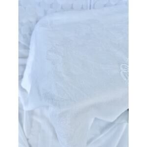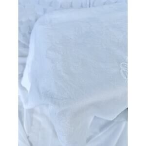Vintage White 100% Linen DAMASK Tablecloth Floral Rose Embroidered Monogram