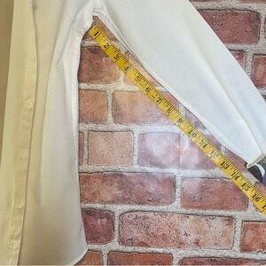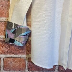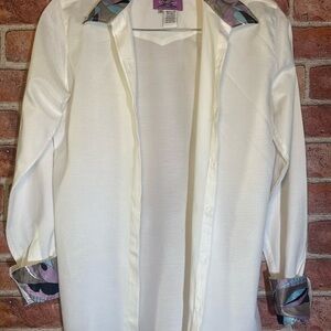 This is a long-sleeve white button-up shirt with a textured fabric, featuring unique patterned accents. The collar and the inside of the cuffs have a colorful design with shades of purple, teal, and black. The shirt has a polished, professional look with subtle details that give it a stylish flair.