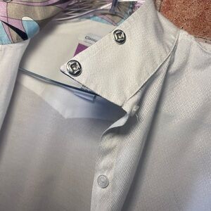 This is a long-sleeve white button-up shirt with a textured fabric, featuring unique patterned accents. The collar and the inside of the cuffs have a colorful design with shades of purple, teal, and black. The shirt has a polished, professional look with subtle details that give it a stylish flair.