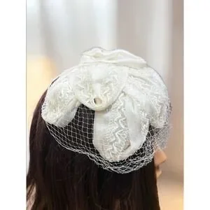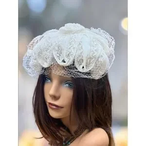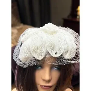 Vintage bridal headpiece showcases a classic pillbox silhouette crafted from elegant white fabric with intricate textured embroidery. A delicate birdcage veil adds a touch of mid-century sophistication, while the top is accented with a fabric rose and structured pleats. This timeless accessory is perfect for a vintage-inspired wedding, formal tea party, or costume event. The interior is lined for comfort, ensuring it stays securely in place for your special occasion.