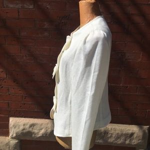 This White cardigan has silk trimming, three detailed bows with gems in the front where the snaps are and shoulder pads.