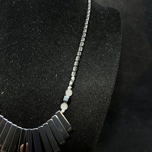 Vintage White Cats Eye And Hematite Graduating V Shaped Bib Necklace. There are no hallmarks on it.