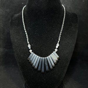 Vintage White Cats Eye And Hematite Graduating V Shaped Bib Necklace 18" (3739)