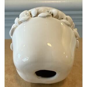 Charming vintage ceramic apple figurine featuring a glossy white glaze and a ring of raised ceramic flowers encircling the middle. The top is accented with a dark metal stem and two sculpted leaves, creating a beautiful contrast of texture and color.