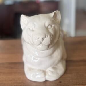 Vintage White Ceramic Big Cat Planter with Floral Design