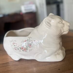 Bring a touch of whimsy and charm to your space with this unique vintage ceramic big cat planter. Featuring a graceful reclining feline form, this piece is finished in glossy white glaze with delicate pink and green floral transfers along both sides. Perfect for holding small plants, flowers, or as a statement piece for your shelf or table.