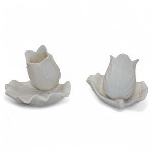 These delicate candle holders resemble tulips resting on leaves, a timeless design evoking nature's elegance. Crafted in smooth white ceramic, they bring a serene charm to any space.