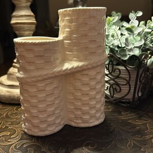 Vintage white ceramic vase with embossed basket weave tied together with an embossed rope. Three-in-one vase in excellent condition. Marked on bottom, made in Japan.