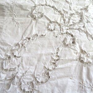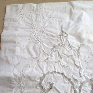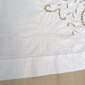 Vintage White Cotton Battenburg Lace Embroidered Cutwork Tablecloth with Floral Design