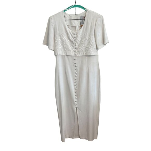 This vintage white pencil dress features an embroidered faux bolero top, offering a unique couture-like style perfect for special occasions. Its timeless design and elegant fit make it a standout piece.