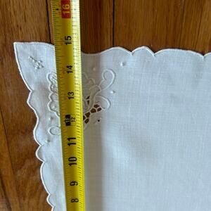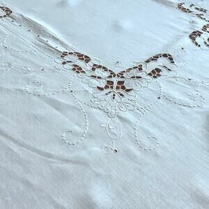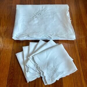 Beautiful vintage white linen tablecloth with matching embroidered napkins. The tablecloth features delicate cutwork accents, floral embroidery, and scalloped edges throughout. Includes six coordinating napkins, each with matching embroidery and scalloped hems.