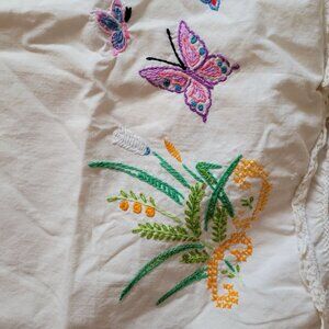 Decorative pillowcase with vibrant embroidered floral and butterfly design. White cotton fabric with lace trim, ideal for adding a vintage touch.