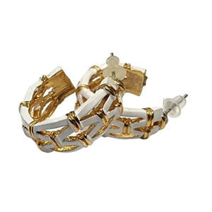 Elegant vintage half hoop earrings featuring a unique bamboo-inspired design with pristine white enamel and rich gold tone. These chic earrings offer a sophisticated blend of modern and vintage styles, making them a perfect accessory to add a touch of class and refinement to any outfit.