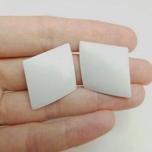 Vintage White Enamel Diamond Shape Clip On Earrings, Minimal Retro 80s Style