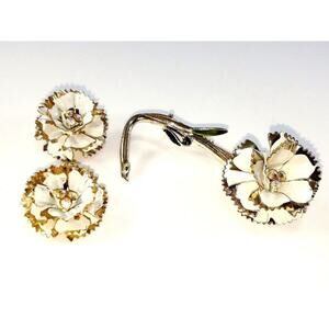 This lovely vintage 1960s floral demi-parure includes a white enamel flower brooch and matching clip-on earrings, all in gold-tone metal with shimmering aurora borealis rhinestone centers.
