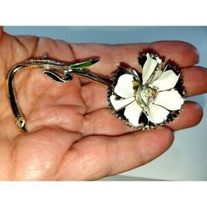 Great vintage condition. Minor enamel wear and light signs of age under magnification. The brooch flower swivels slightly on its screw-type mount, which is common in this design.