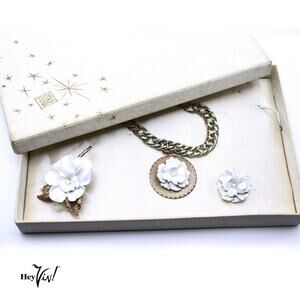 * Special Feature: Vintage 3 Piece Enamel Set with white rose pin, clip on earrings, and bracelet with hanging pendant.