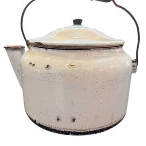 This vintage enamel teapot offers a classic design with a durable wooden handle, suitable for display or functional use.