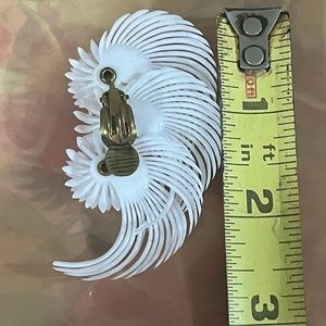 Snow White soft plastic feather fan earrings, each with three overlapping feathers /fronds, three daisy flowers centered by a prong set pearl bead. Each earring is 2 1/2" long. Goldtone clip backs nice and strong. Fun, Frivolous, and oh so SASSY Statement earrings to set your tone for Spring. New and never worn...still on original card from the 1980s or before. These are light and comfortable to wear.