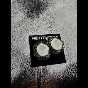 These elegant clip-on earrings feature delicate white floral designs with a shimmering center, set against an intricate silver-tone filigree backing. A perfect accessory for adding vintage charm to any outfit, ideal for both casual and formal occasions. No pierced ears required!