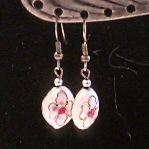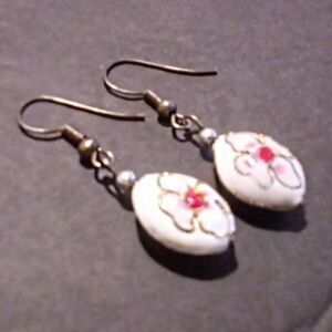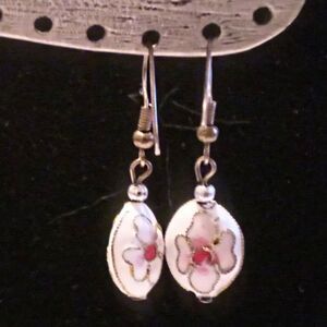 These charming Vintage White Floral Cloisonné Drop Earrings exude elegance and timeless beauty. Designed for pierced ears, they feature delicate wire hooks that hold stunning oval-shaped cloisonné drops. The drops are adorned with intricate white floral patterns, creating a striking contrast against the smooth, glossy enamel finish. Measuring 1 1/2" in length from the top of the hook, these earrings dangle gracefully, adding a touch of vintage sophistication to any outfit. Perfect for those who appreciate classic, handcrafted jewelry with a touch of artistic flair.