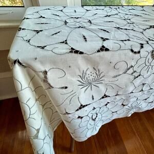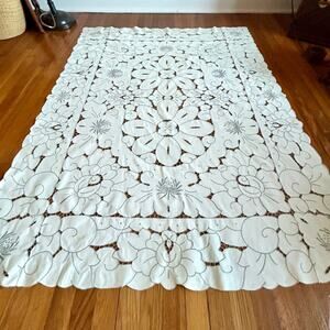 Vintage White Floral Cutwork Tablecloth Rectangle 63 x 48