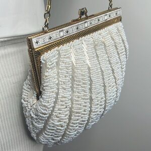 Vintage White Glass Beaded Enamel Frame Evening Handbag