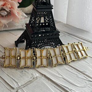 This lovely vintage white & gold bracelet is in perfect condition. It simple lines, let's you wear it with something casual or a more dressed up affair. The shape of the stones are square & made out of a very hard plastic materail.