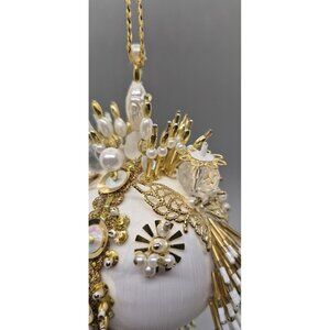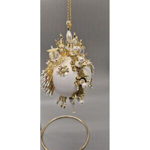 Mint condition & is absolutely stunning. Meticulous in detail with butterfly accents. Sparkles at any given placement , whether on the stand or in your Christmas tree. You will not be disappointed. It's a perfect piece if your colors are white & gold. Stand measures 12" & ornament approximately 6.5 -7"H.