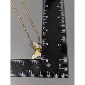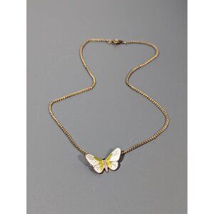 Vintage White Green Enamel Butterfly Pendant Necklace Gold tone 16"