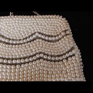 Vintage White & Grey Beaded Kiss Lock Clutch Purse Silver Chain