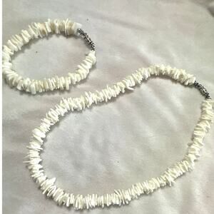 Vintage White Hawaiian 15" Chipped Puka Sea Shell Necklace and Bracelet