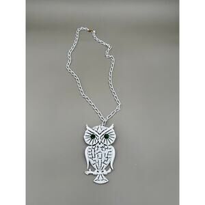 Vintage white horned owl with green rhinestone eyes pendant necklace