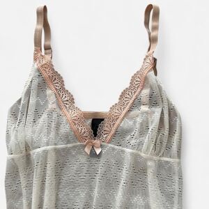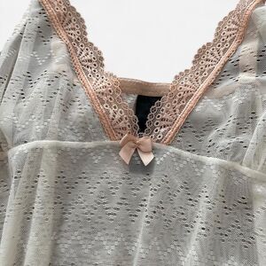 Vintage romantic 💫 White lace semi-sheer babydoll cami tank with sweetheart neckline, bow accent + adjustable straps. Sheer eyelet pattern with stretch. Runs like S/M, good condition.