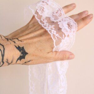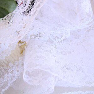 Sweet Vintage Lace Trim. Snow White, delicate and just lovely. Looks and feels like nylon probably, 2.25" wide at its widest point. Perfect for lingerie, headbands, jewelry, altered journals and lots more. Listing is for three yards. Additional yards will be sent as one continuous piece.
