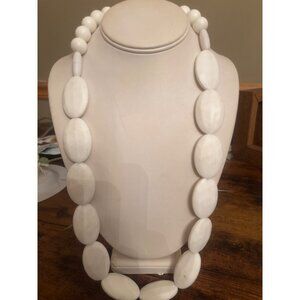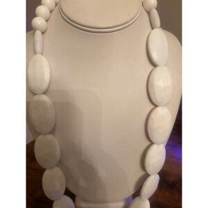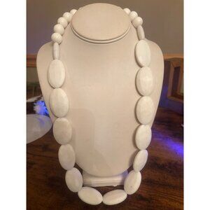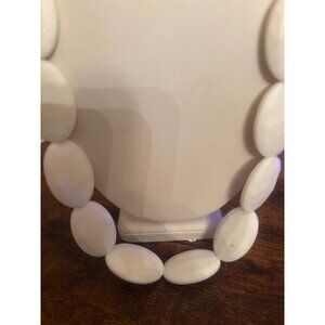 Step into timeless retro chic with this authentic vintage Lucite bead necklace. Featuring oversized white faceted oval and round beads, this bold piece embodies the playful mod fashion of the 1960s–1980s.