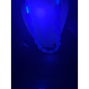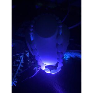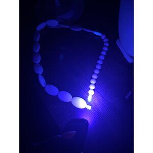Crafted in lightweight yet durable Lucite (acrylic resin), the beads give off a soft bluish glow under UV light — a signature hallmark of true vintage Lucite. The design is completed with a clever peg-and-socket hidden clasp, allowing the necklace to flow seamlessly as one continuous strand.