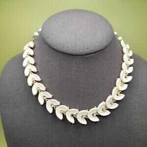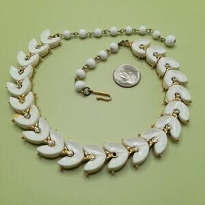 Description: This is a mid-century white Lucite leaves choker necklace with tiny clear rhinestone accents on a gold tone background from the 1950s. Due to age, two of the tiny clear rhinestones are missing and could be easily replaced. See photos for details. Otherwise, it is in wonderful condition. This would be a great addition to your jewelry collection or make a great gift!