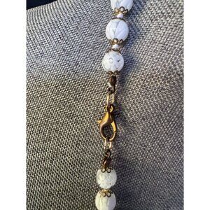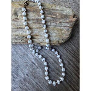 Vintage White Marbled Glass Bead Necklace With Brass Accents & Lobster Clasp