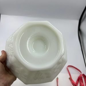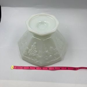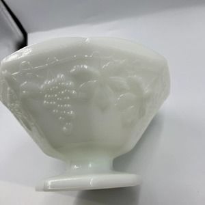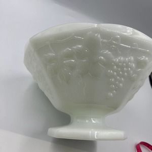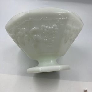Vintage white milk glass, raised grapes and grape leaf pattern, large serving decorative pedestal bowl. Bowl is in very good condition as pictured.