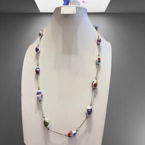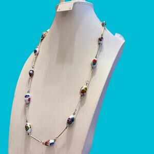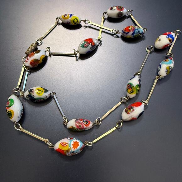 This exquisite vintage necklace is a true work of art. Featuring white multi-colored Murano glass beads in the millefiori style, it is a stunning piece sure to impress. It measures 30" in length and has a vintage screw clasp. This necklace is perfect for any occasion and is in strong preloved condition.