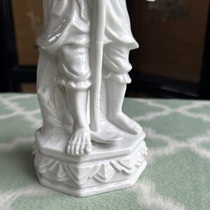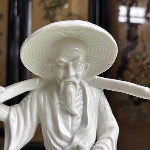 Excellent condition white porcelain figurine of an Asian man in traditional attire carrying a yoke. No damage. About 12” tall.