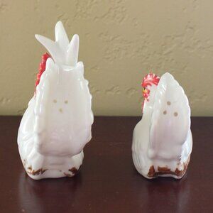 This vintage salt and pepper set features a rooster and hen made of white porcelain. There isn't a label or any markings so the manufacturer or country of origin is unknown.