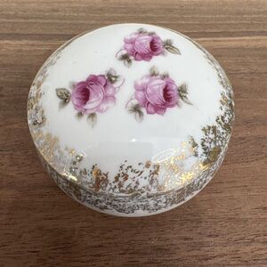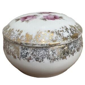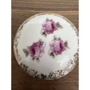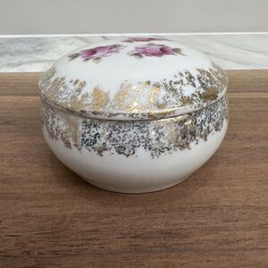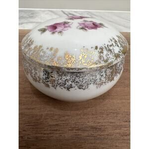 Vintage White Porcelain Painted Floral Rose Silver Trim Trinket Jewelry Box Dish