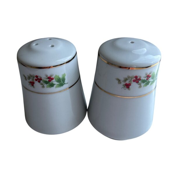 Elevate your dining experience with these charming porcelain salt and pepper shakers. The elegant gold trim and holly design add a festive touch to any table setting. Crafted with care, these vintage pieces offer both functionality and style, making them a delightful addition to your collection. In great condition.