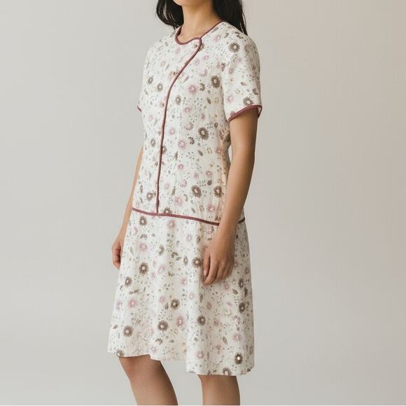 This vintage 1960s kimono-style dress by Rebecca’s features a white base with purple floral print, drop waist, short sleeves, and hidden snap front. Soft sheen silk feel. Made in Tarlac, Philippines. Tag missing, fits like Medium.